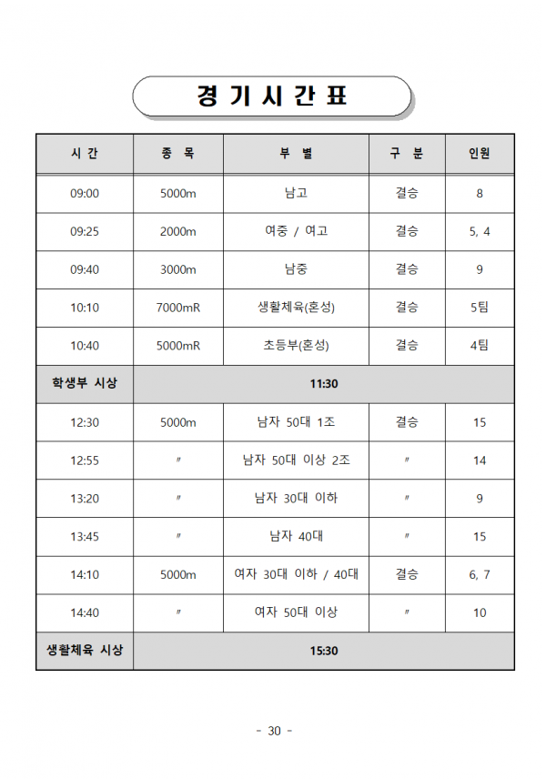 공지사항 보기 제목 2023 교육감기 장거리달리기 대회 및 생활체육 장거리달리기대회 시간표 조회수 2,955회 관련링크 본문 대회시간표 참조하여 주시기 바랍니다. 감사합니다. 이전글 다음글 목록