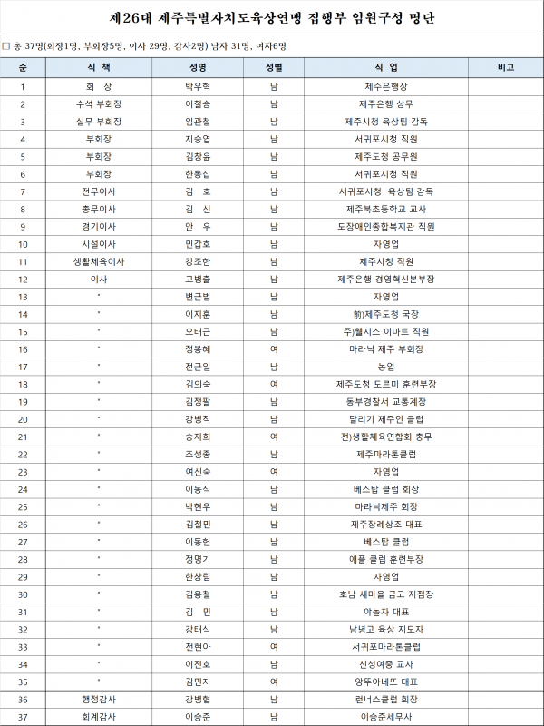 제26대 제주특별자치도육상연맹 집행부 임원구성 명단