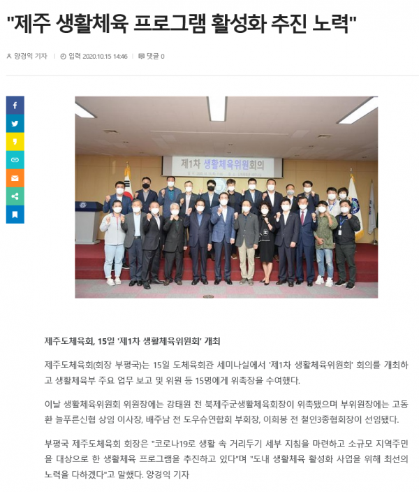 부평국 제주도체육회 회장은 "코로나19로 생활 속 거리두기 세부 지침을 마련하고 소규모 지역주민을 대상으로 한 생활체육 프로그램을 추진하고 있다"며 "도내 생활체육 활성화 사업을 위해 최선의 노력을 다하겠다"고 말했다. 양경익 기자